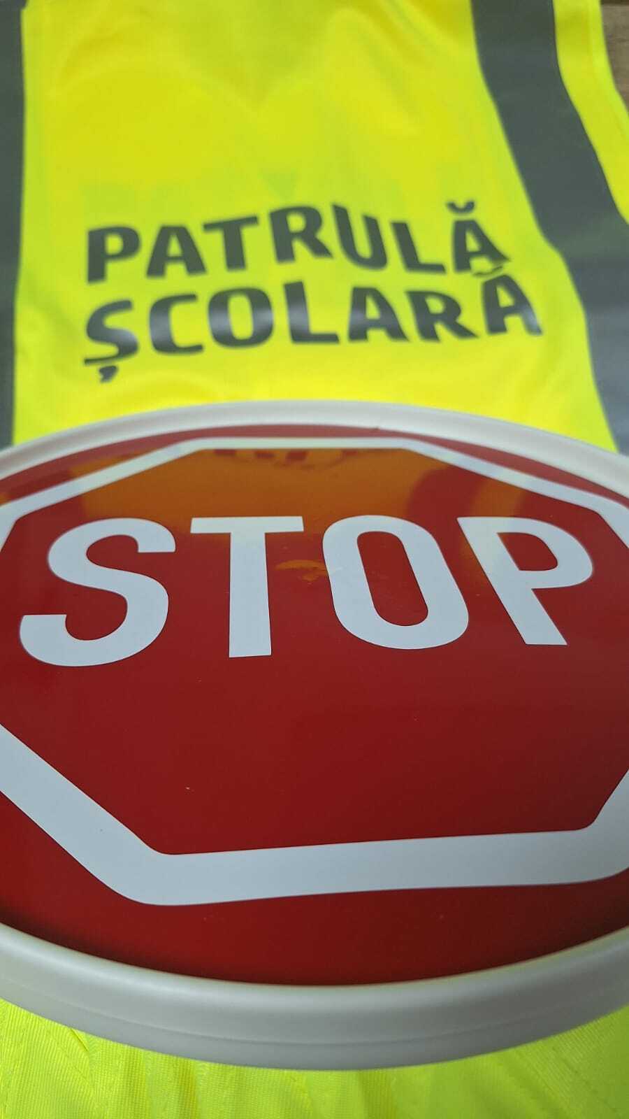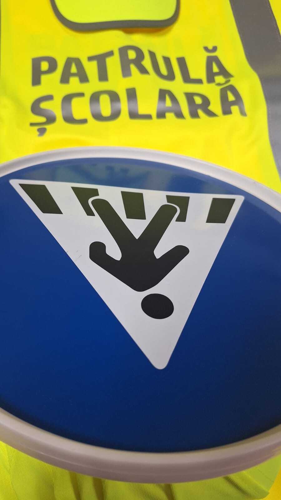 PALETĂ, confecționată din material plastic pe o parte înscrisul “STOP”, iar pe cealaltă indicatorul specific, care permite traversarea drumului public. Dimensiunile plăcuțelor inscripționate cu semnul de circulație de 27/27 de centimetri, cu mâner detașabil de 150 de centimetri, în conformitate cu normativele Uniunii Europene în domeniu, pentru a oferi vizibilitate în trafic și pentru protecția elevului care o utilizează – 2 bucăți